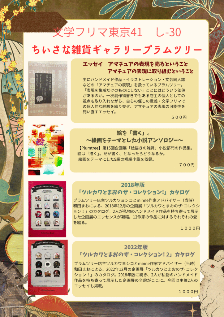 11月23日(日・祝)東京ビッグサイトにて開催される【文学フリマ東京41】に「ちいさな雑貨ギャラリープラムツリー」として出店いたします。